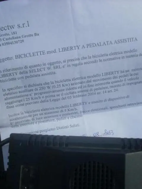 Bicicletta elettrica del 08/2013 esente da assicurazione obbligatoria e senza casco con bauletto e carica batteria originale. Contatti: 3388624728 o 0804965554