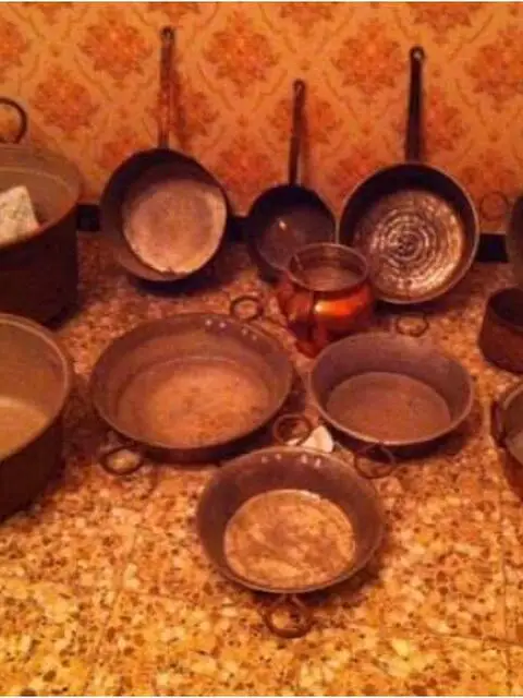 Set di pentole di rame di vaie dimensioni come si vede da foto da cm 10 a cm 40 non restaurate ma integre composto da n° 13 pezzi a € 1200 specchiera da toilette a € 150 candelabro a € 200 3482987046