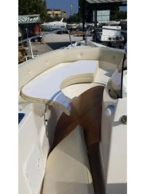 Caratteristiche Generali: Cantiere e modello: AS MARINE – 590 open Lunghezza f.t.: 5,90 mt Larghezza: 2,50 mt Portata persone: 8 Peso (senza motore): 780 kg Potenza max: 150 CV – 110 kW Descrizione: Barca open confortevole con ampi spazi, ideale per trascorrere giornate intere sull’acqua, consolle laterale con comoda seduta guida, ampio prendisole di prua con chaise-longue – grande prendisole di poppa- passaggio centrale su specchio di poppa – mobiletto wetbar con lavello e spazio per frigo. Accessori di serie: Carena bianca, cuscineria completa color beige, prendisole di prua, musone prua, bitte, ganci di alaggio, corrimano prua, parabrezza completa di corrimano in acciaio inox, scaletta bagno in acciaio inox, impianto elettrico completo di bussola, tromba, luci di via, luce 360°, presa di corrente 12 V, pompa di sentina Package con motore: MERCURY EFI ELPT 40/60 PRO: 17.100,00 € + iva MERCURY F80 EFI ELPT: 18.900,00 € + iva MERCURY 115 EFI (115 CV): 19.900,00 € + iva *escl. spese trasporto Prezzo escluso di IVA